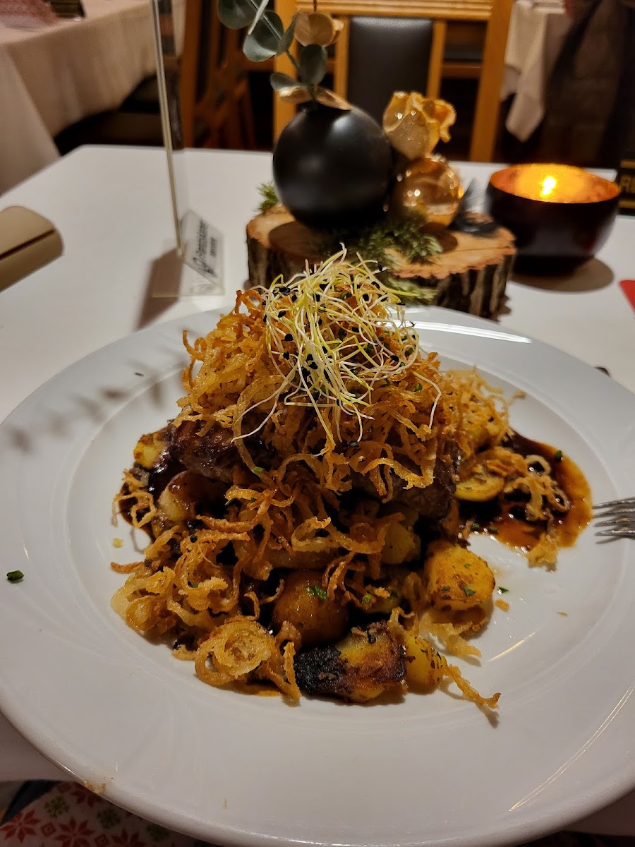 von der Rinderlende mit Röstzwiebeln und Bratkartoffeln