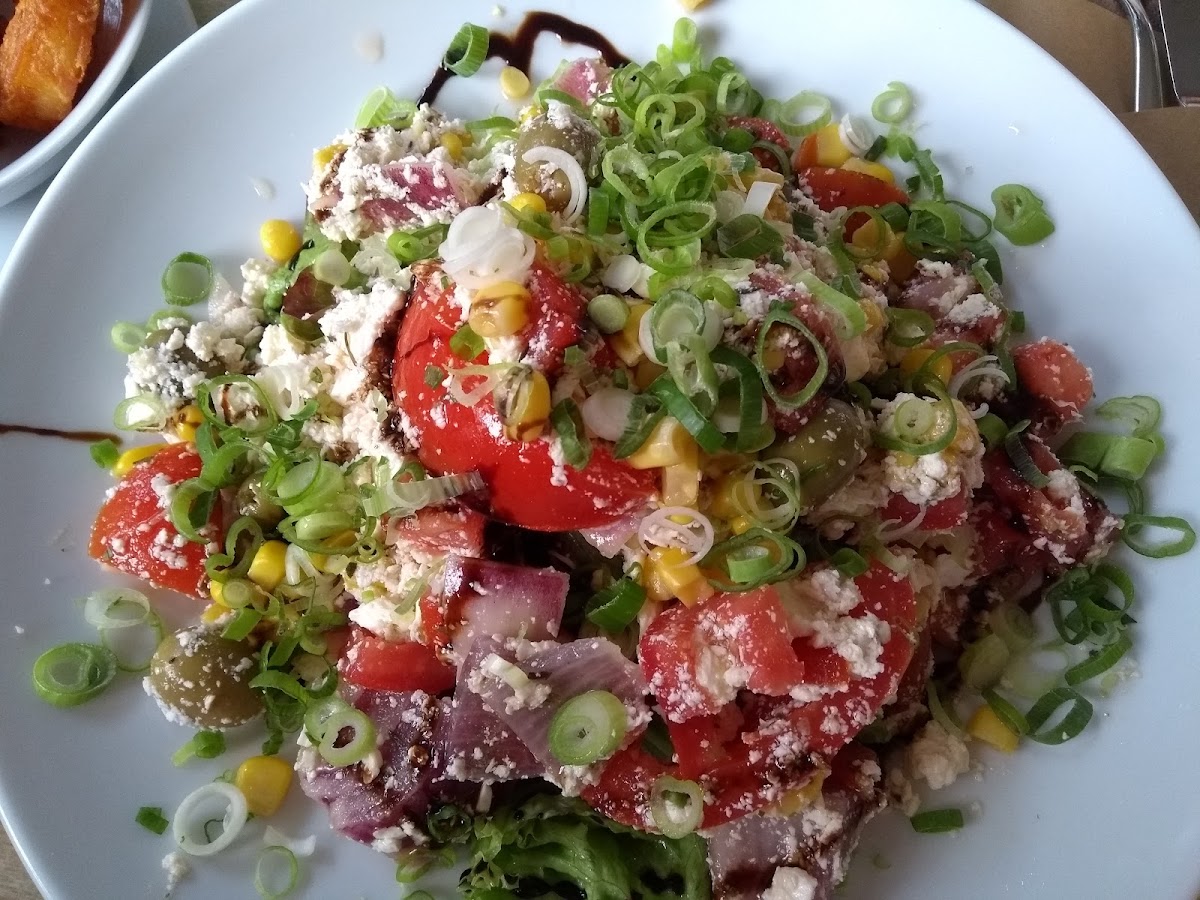 mit Reibeschmelz, Zwiebelflocken und Salat